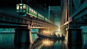 浜名湖と遠州灘を繋ぐ今切口から中に入った、弁天島の橋脚に船を固定し、引き潮に乗って流れ出す、奥浜名湖の車えびを網ですくうという、浜名湖の伝統的な漁法です。