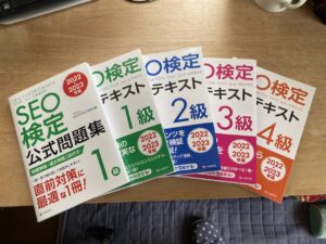 SEO検定試験1級の試験範囲は4級、3級、2級の範囲も含まれるため、4級〜1級全てのテキストを購入し勉強しています。
