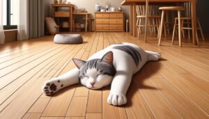 [chat face=”ca256074b9f0618f99c7a9ec6c648e16.jpg” name=”ゆず” align=”right” border=”yellow” bg=”none”]夏場は床が一番だ。